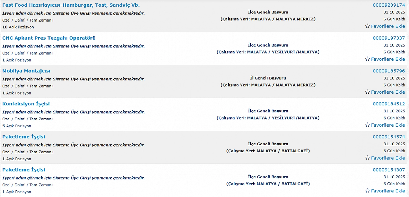 İŞKUR, Malatya'da farklı sektörlerde istihdam edilmek üzere toplam 290 kişilik personel alımı yapılacağını duyurdu. Ahşap Mobilya İmalat Ustası, Ön Muhasebeci, Makineci (Dikiş), Konfeksiyon İşçisi, Depo Sevkiyat Sorumlusu, E-Ticaret ve Pazarlama Elemanı, Tahin İmal İşçisi gibi birçok pozisyonda istihdam sağlanacak. İşte detaylar…