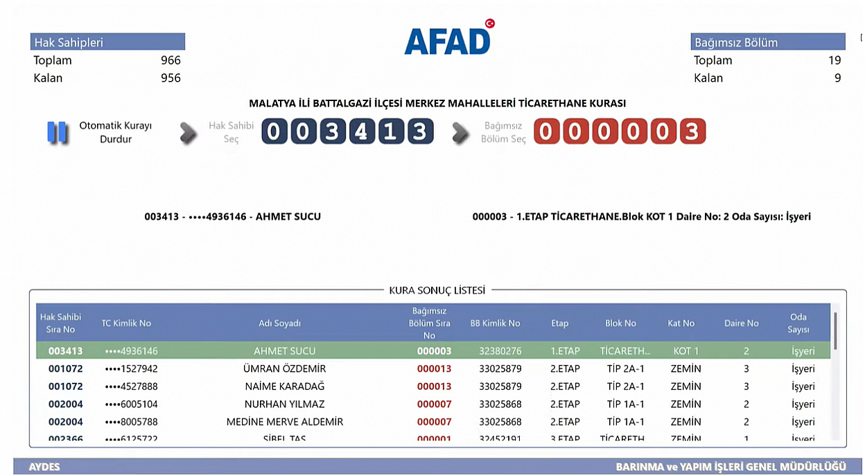 6 Şubat depremlerinde büyük yıkım yaşayan Malatya'da, konut, iş yeri ve kırsal konut inşa çalışmaları hızla devam ediyor. 15 Kasım'da gerçekleştirilen kura çekimiyle birlikte Malatya'da toplam 20 bin 925 konut ve 835 iş yerinin hak sahipleri belirlendi. Peki, Yeşilyurt, Battalgazi, Doğanşehir, Yazıhan, Hekimhan ve diğer ilçelerde kimlere konut ve iş yeri çıktı? İşte detaylar…