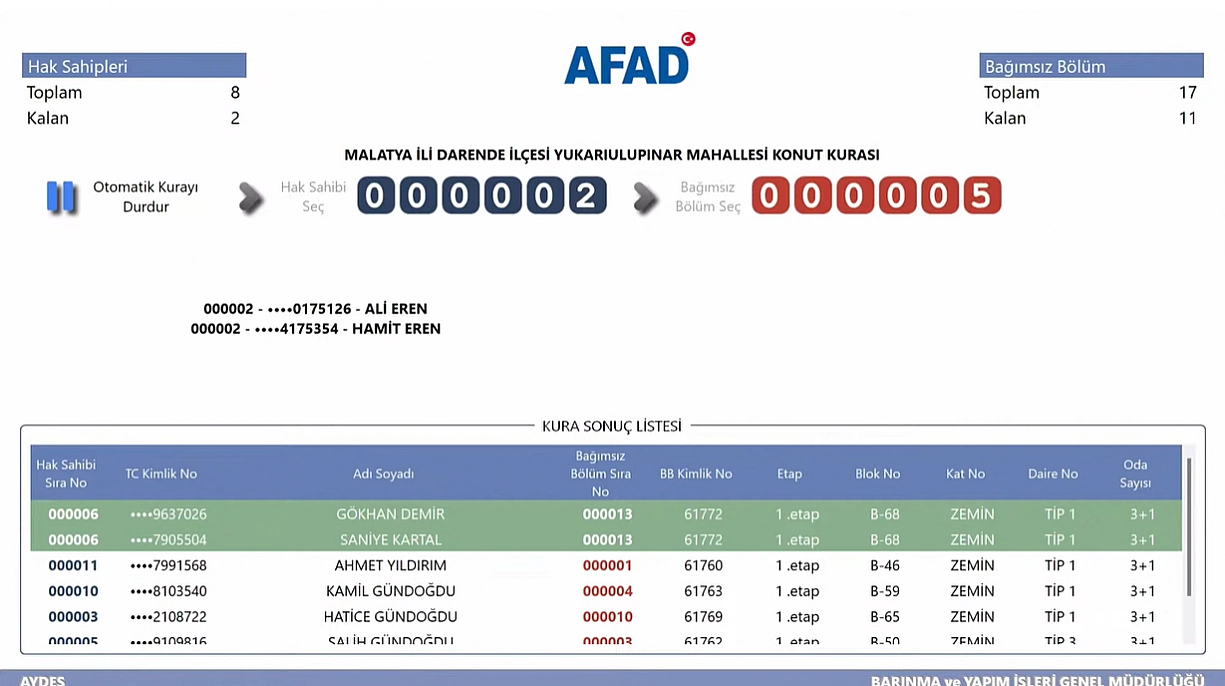 6 Şubat depremlerinde büyük yıkım yaşayan Malatya'da, konut, iş yeri ve kırsal konut inşa çalışmaları hızla devam ediyor. 15 Kasım'da gerçekleştirilen kura çekimiyle birlikte Malatya'da toplam 20 bin 925 konut ve 835 iş yerinin hak sahipleri belirlendi. Peki, Yeşilyurt, Battalgazi, Doğanşehir, Yazıhan, Hekimhan ve diğer ilçelerde kimlere konut ve iş yeri çıktı? İşte detaylar…