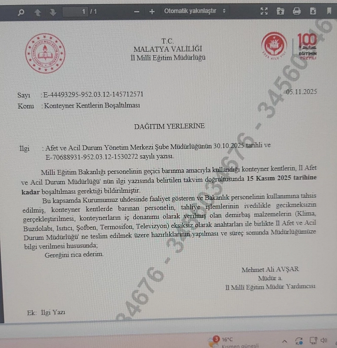 Malatya İl Milli Eğitim Müdürlüğü, 5 Kasım’da ilgili yerlere gönderdiği yazıda yüzlerce eğitim çalışanına, eğitim-öğretim yılının tam ortasında konteynerlerini 10 gün içinde boşaltma emri verdi. İl Milli Eğitim Müdürlüğünün aldığı karara tepki gösteren Eğitim Gücü Sen İl Başkanı Yusuf Yılmazoğlu, aceleyle alınan kararın hem eğitimcileri mağdur edeceğini hem de kentte barınma krizini ortaya çıkaracağını vurguladı. Yılmazoğlu, kararın yaratacağı krizlere değinirken, çözüm önerilerini de sıraladı.