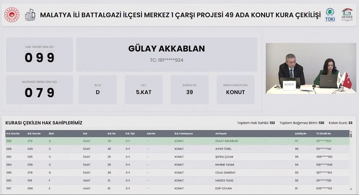 Malatya'da 6 Şubat 2023'teki depremlerde yıkılan veya ağır hasar gören ve yapımı tamamlanan konutların kurası çekiliyor. Battalgazi ilçesi Merkez 1 Çarşı Projesi 49 Ada kapsamında 130 konutun kura çekiminin sonuçları belli oldu.