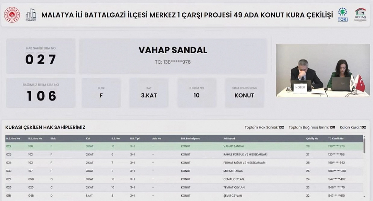 Malatya'da 6 Şubat 2023'teki depremlerde yıkılan veya ağır hasar gören ve yapımı tamamlanan konutların kurası çekiliyor. Battalgazi ilçesi Merkez 1 Çarşı Projesi 49 Ada kapsamında 130 konutun kura çekiminin sonuçları belli oldu.