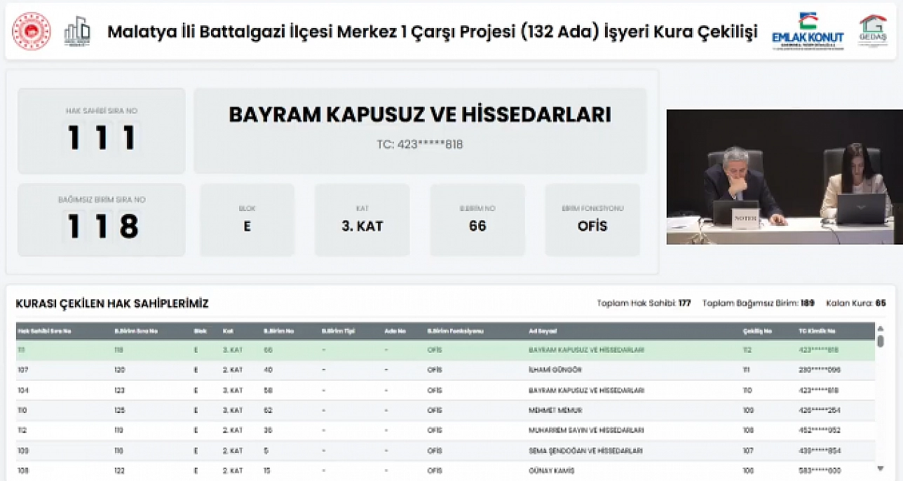 6 Şubat depremlerinin ardından Malatya'nın birçok noktasında kalıcı konut ve iş yeri projeleri tamamlandı. Battalgazi ilçesindeki Merkez 1 Çarşı Projesi (132 ADA) rezerv alan içerisinde yer alan 103 dükkân, 86 ofis toplam 189 iş yerinin gerçekleştirilen kura çekimiyle hak sahipleri belli oldu. İşte detaylar…