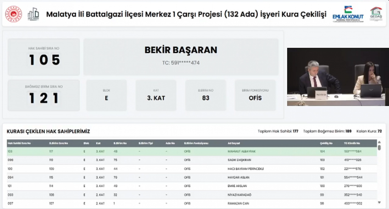 6 Şubat depremlerinin ardından Malatya'nın birçok noktasında kalıcı konut ve iş yeri projeleri tamamlandı. Battalgazi ilçesindeki Merkez 1 Çarşı Projesi (132 ADA) rezerv alan içerisinde yer alan 103 dükkân, 86 ofis toplam 189 iş yerinin gerçekleştirilen kura çekimiyle hak sahipleri belli oldu. İşte detaylar…