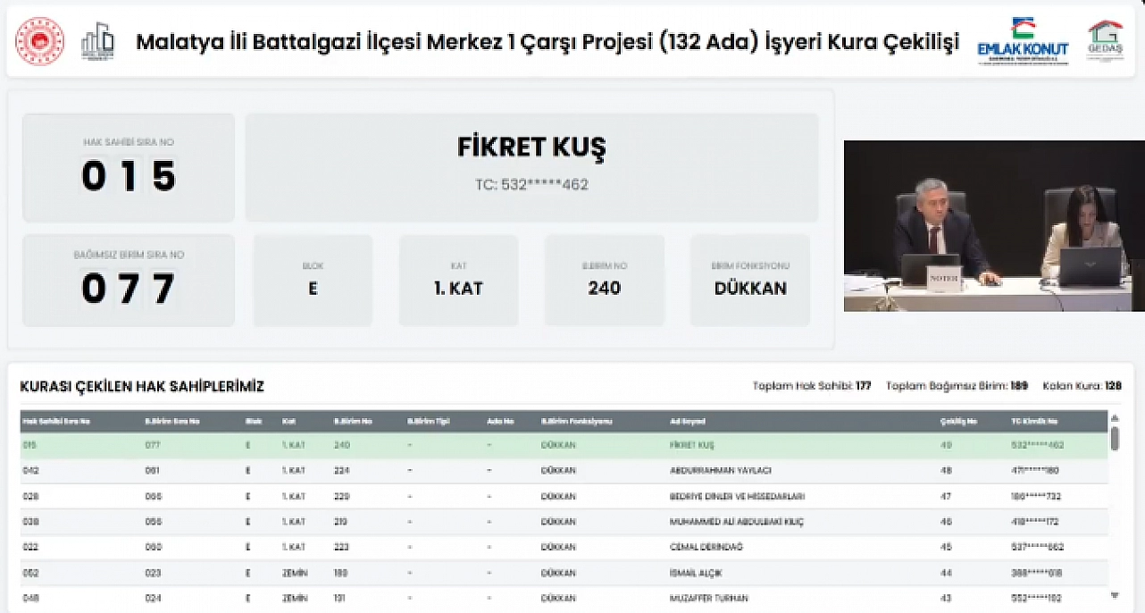 6 Şubat depremlerinin ardından Malatya'nın birçok noktasında kalıcı konut ve iş yeri projeleri tamamlandı. Battalgazi ilçesindeki Merkez 1 Çarşı Projesi (132 ADA) rezerv alan içerisinde yer alan 103 dükkân, 86 ofis toplam 189 iş yerinin gerçekleştirilen kura çekimiyle hak sahipleri belli oldu. İşte detaylar…