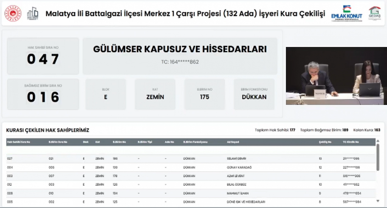 6 Şubat depremlerinin ardından Malatya'nın birçok noktasında kalıcı konut ve iş yeri projeleri tamamlandı. Battalgazi ilçesindeki Merkez 1 Çarşı Projesi (132 ADA) rezerv alan içerisinde yer alan 103 dükkân, 86 ofis toplam 189 iş yerinin gerçekleştirilen kura çekimiyle hak sahipleri belli oldu. İşte detaylar…
