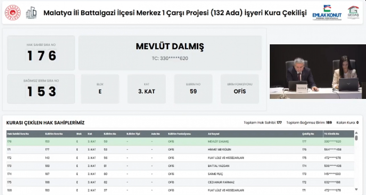 6 Şubat depremlerinin ardından Malatya'nın birçok noktasında kalıcı konut ve iş yeri projeleri tamamlandı. Battalgazi ilçesindeki Merkez 1 Çarşı Projesi (132 ADA) rezerv alan içerisinde yer alan 103 dükkân, 86 ofis toplam 189 iş yerinin gerçekleştirilen kura çekimiyle hak sahipleri belli oldu. İşte detaylar…