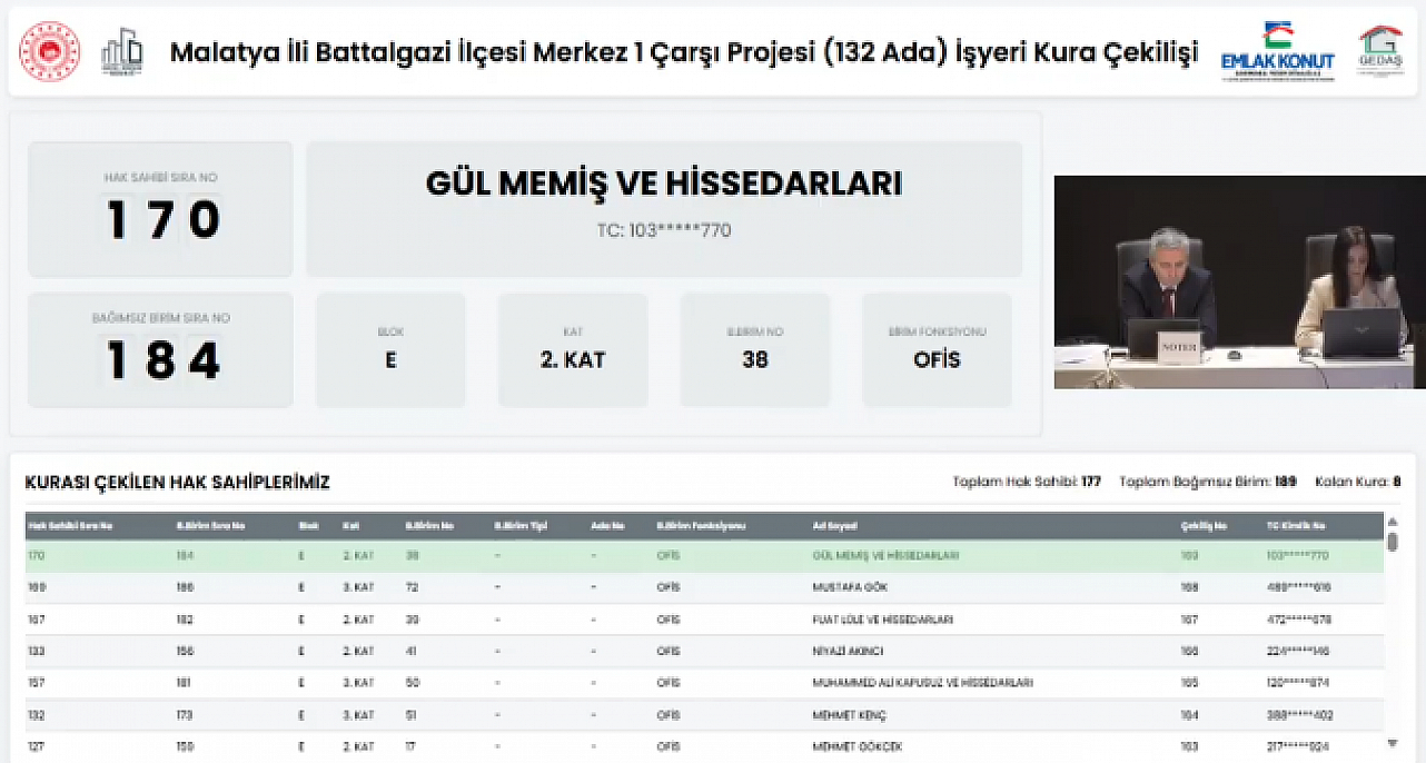 6 Şubat depremlerinin ardından Malatya'nın birçok noktasında kalıcı konut ve iş yeri projeleri tamamlandı. Battalgazi ilçesindeki Merkez 1 Çarşı Projesi (132 ADA) rezerv alan içerisinde yer alan 103 dükkân, 86 ofis toplam 189 iş yerinin gerçekleştirilen kura çekimiyle hak sahipleri belli oldu. İşte detaylar…