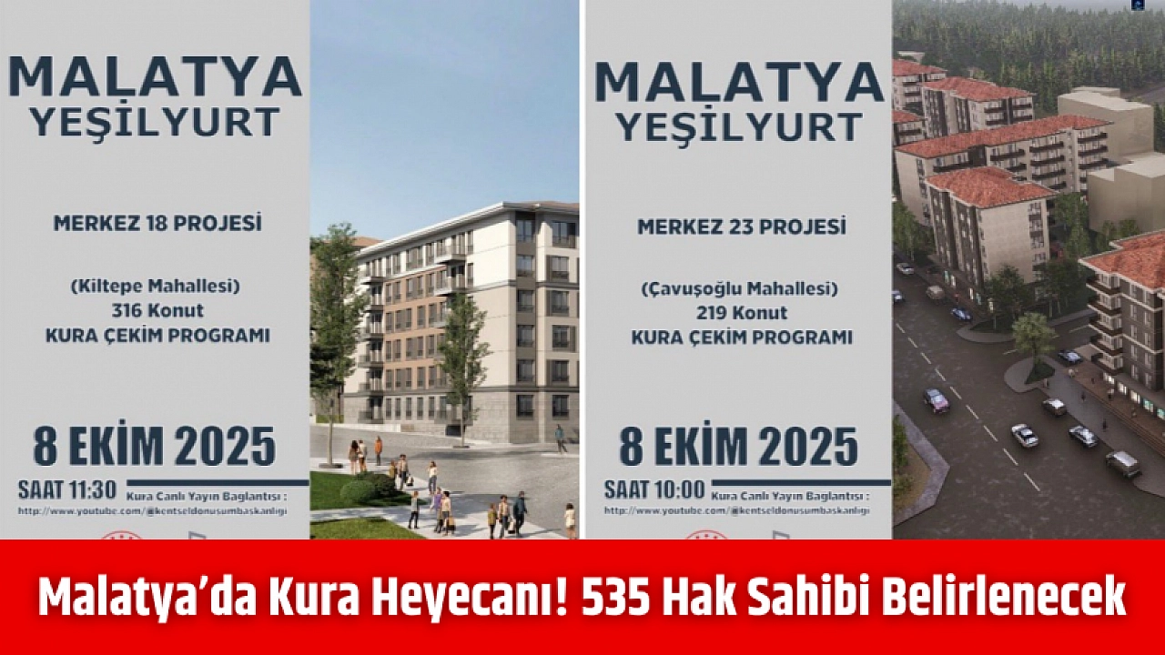 Kentsel Dönüşüm Başkanlığı, Malatya'da Yeşilyurt ilçesindeki iki projede inşa edilen toplam 535 konutun hak sahiplerini 8 Ekim Çarşamba günü noter huzurunda yapılacak kura çekimiyle belirleyecek.