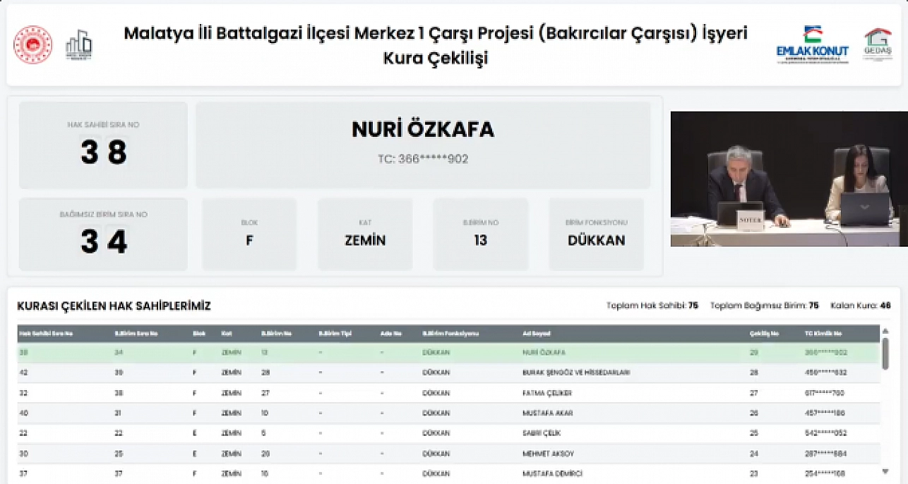 6 Şubat depremlerinin ardından Malatya'nın birçok noktasında kalıcı konut ve iş yeri projeleri tamamlandı. Battalgazi ilçesindeki Merkez 1 Çarşı Projesi Bakırcılar Çarşısı'nda yer alan 75 iş yerinin gerçekleştirilen kura çekimiyle hak sahipleri belli oldu. İşte detaylar…