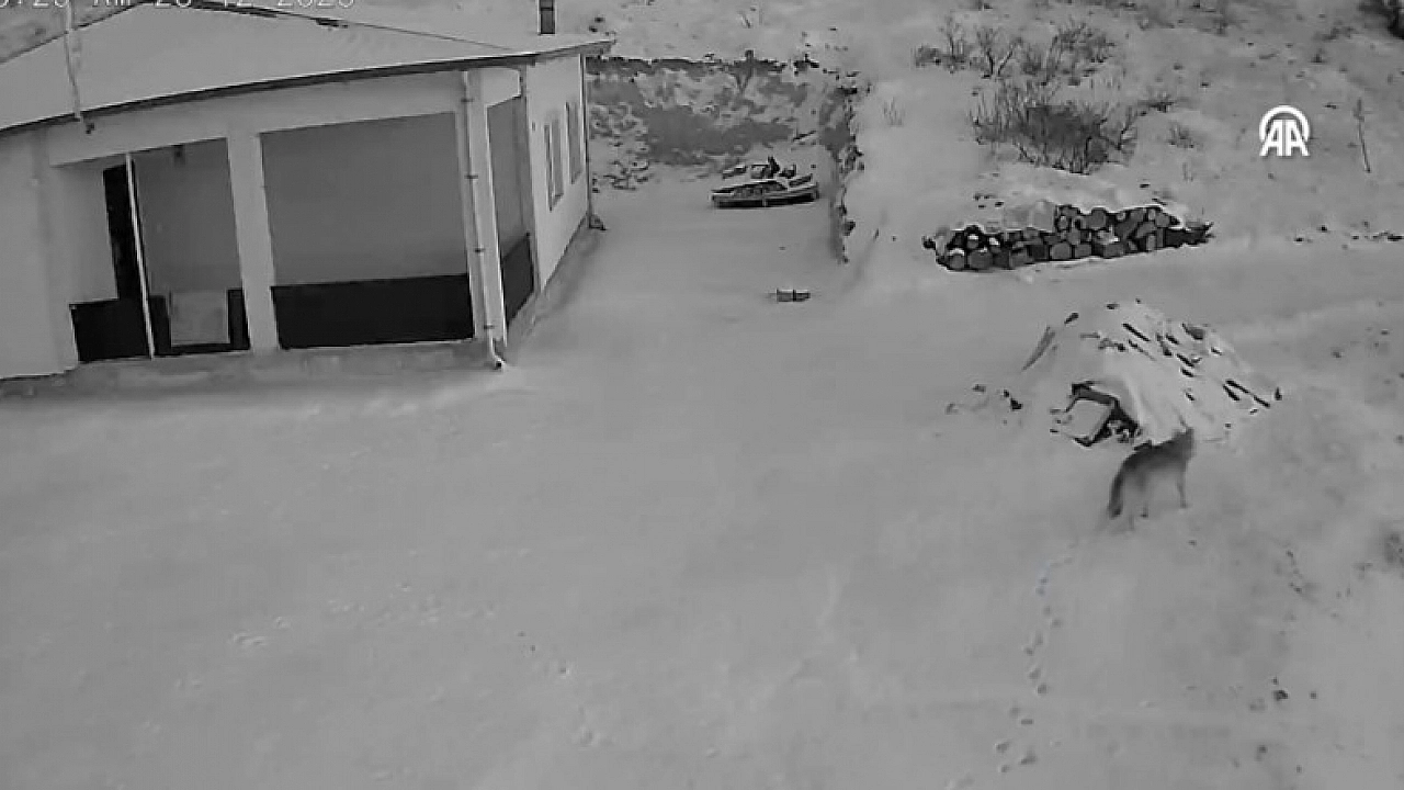 Güvenlik kamerasının kaydettiği görüntüde, yerleşim yerine inen kurdun çevreyi kontrol ettikten sonra gözden kaybolması yer alıyor.