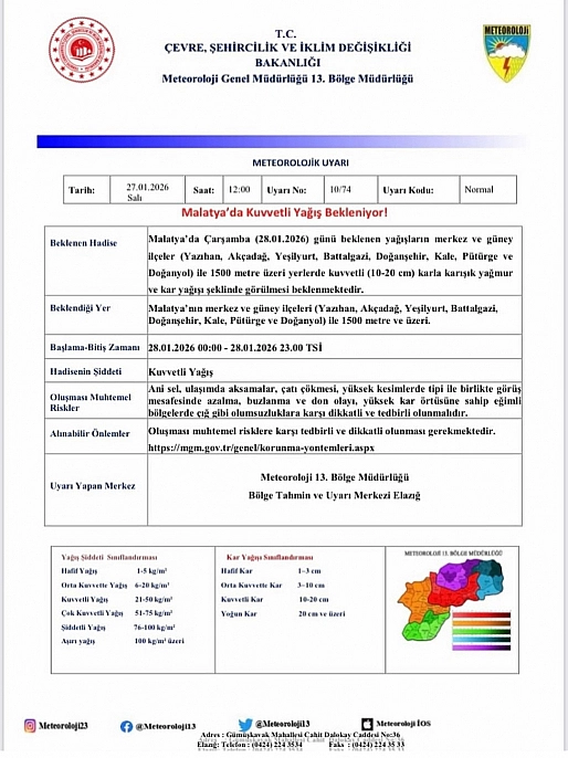 Meteoroloji 13. Bölge Müdürlüğü, Malatya'da Çarşamba (28.01.2026 ) günü beklenen kar yağışı nedeniyle merkez ve güney ilçelerde oluşması muhtemel risklere karşı vatandaşları uyardı.