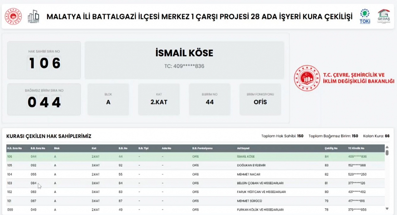 6 Şubat depremlerinde büyük yıkım yaşayan Malatya'da konut ve iş yeri inşa çalışmaları hızla sürüyor. Battalgazi ilçesine bağlı Merkez 1 Çarşı Projesi'nin 28. adasında yer alan ofislerin kura çekimiyle hak sahipleri belli oldu. İşte hak sahibi tam liste...