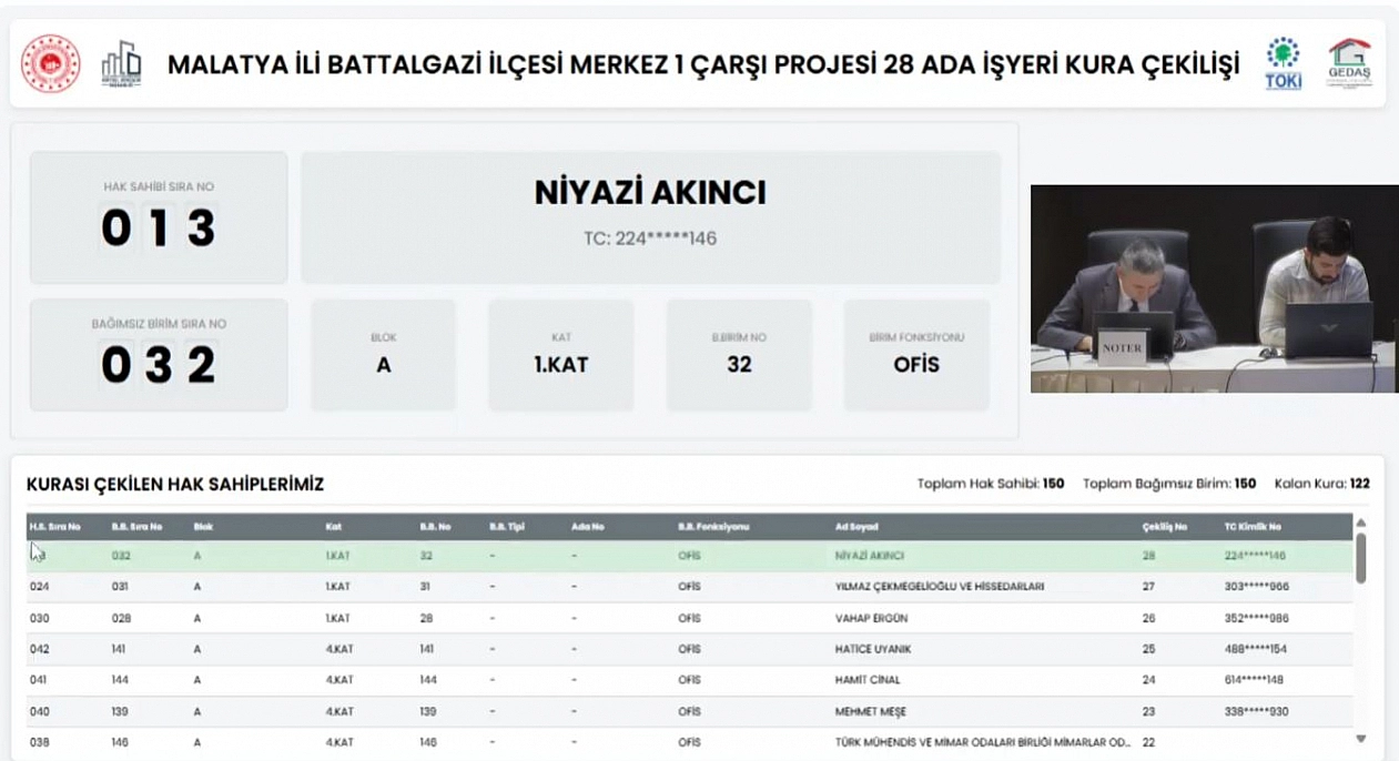 6 Şubat depremlerinde büyük yıkım yaşayan Malatya'da konut ve iş yeri inşa çalışmaları hızla sürüyor. Battalgazi ilçesine bağlı Merkez 1 Çarşı Projesi'nin 28. adasında yer alan ofislerin kura çekimiyle hak sahipleri belli oldu. İşte hak sahibi tam liste...