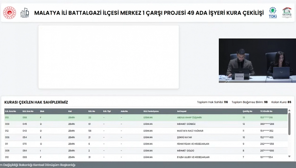 6 Şubat depremlerinin ardından Malatya'nın birçok noktasında kalıcı konut ve iş yeri projeleri tamamlandı. Battalgazi ilçesindeki Merkez 1 Çarşı Projesi kapsamında 49 Ada işyeri kura çekiminin hak sahipleri belli oldu.