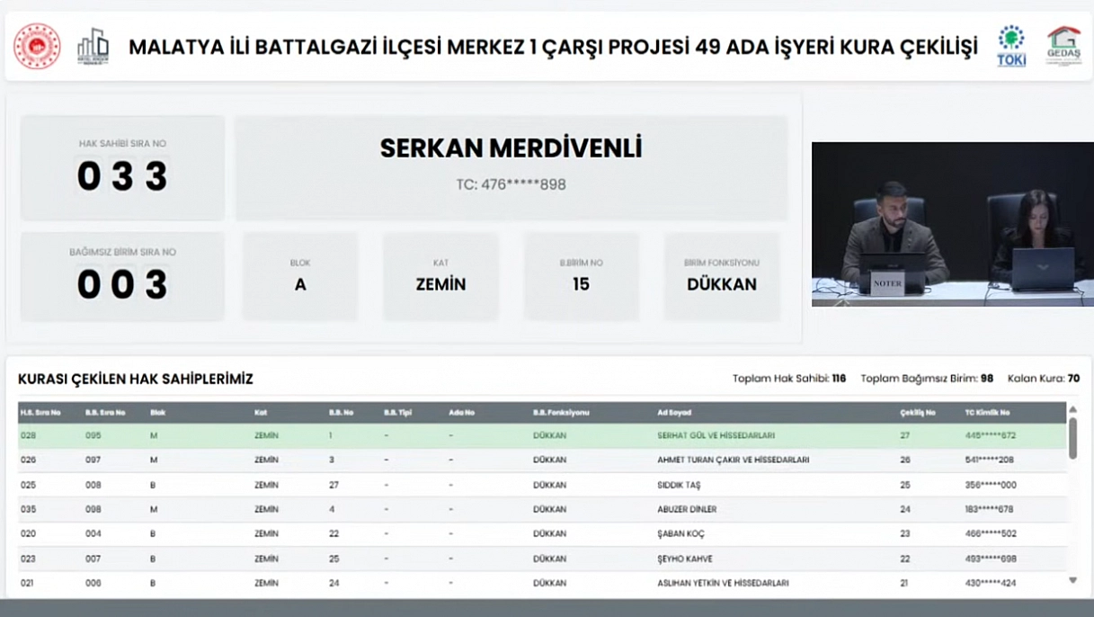 6 Şubat depremlerinin ardından Malatya'nın birçok noktasında kalıcı konut ve iş yeri projeleri tamamlandı. Battalgazi ilçesindeki Merkez 1 Çarşı Projesi kapsamında 49 Ada işyeri kura çekiminin hak sahipleri belli oldu.