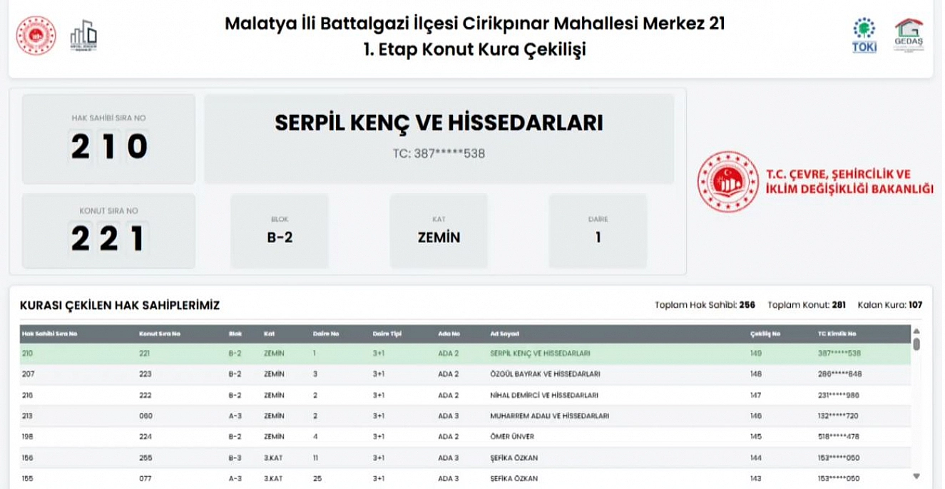Malatya'da 6 Şubat 2023'teki depremlerde yıkılan veya ağır hasar gören ve yapımı tamamlanan konutların kurası çekiliyor. Battalgazi ilçesinde Merkez21 (Etap 1) projesi kapsamında Cirikpınar Mahallesinde 281 konutun kura çekiminin sonuçları belli oldu.