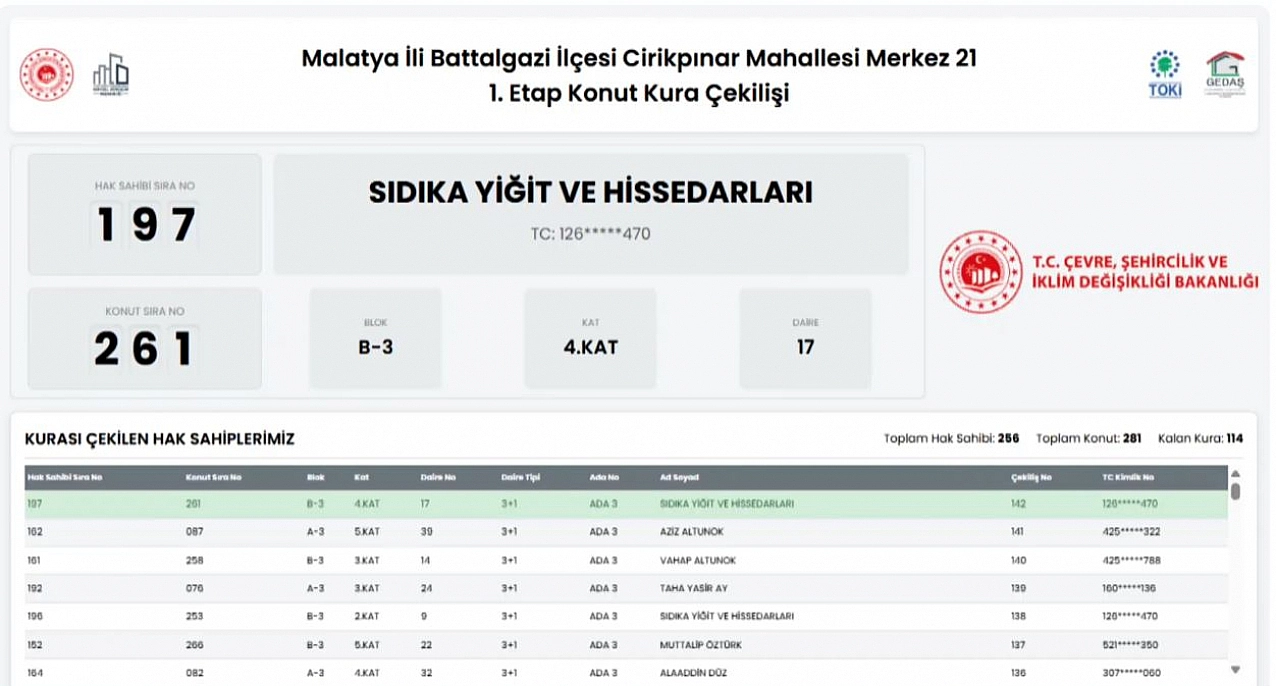 Malatya'da 6 Şubat 2023'teki depremlerde yıkılan veya ağır hasar gören ve yapımı tamamlanan konutların kurası çekiliyor. Battalgazi ilçesinde Merkez21 (Etap 1) projesi kapsamında Cirikpınar Mahallesinde 281 konutun kura çekiminin sonuçları belli oldu.