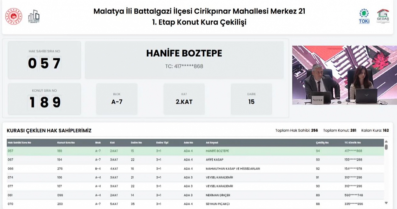 Malatya'da 6 Şubat 2023'teki depremlerde yıkılan veya ağır hasar gören ve yapımı tamamlanan konutların kurası çekiliyor. Battalgazi ilçesinde Merkez21 (Etap 1) projesi kapsamında Cirikpınar Mahallesinde 281 konutun kura çekiminin sonuçları belli oldu.