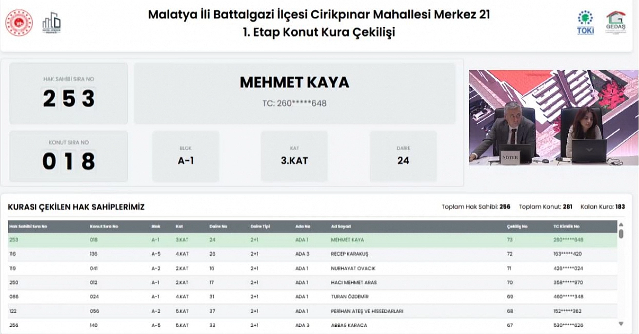Malatya'da 6 Şubat 2023'teki depremlerde yıkılan veya ağır hasar gören ve yapımı tamamlanan konutların kurası çekiliyor. Battalgazi ilçesinde Merkez21 (Etap 1) projesi kapsamında Cirikpınar Mahallesinde 281 konutun kura çekiminin sonuçları belli oldu.
