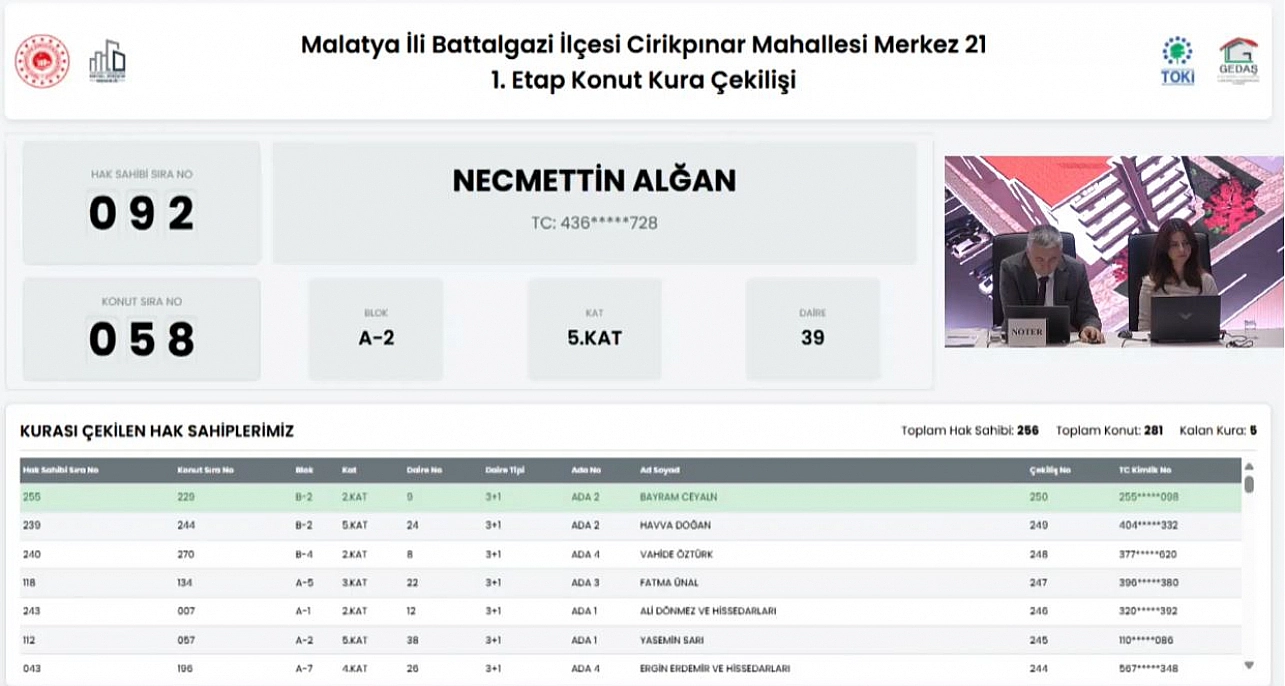 Malatya'da 6 Şubat 2023'teki depremlerde yıkılan veya ağır hasar gören ve yapımı tamamlanan konutların kurası çekiliyor. Battalgazi ilçesinde Merkez21 (Etap 1) projesi kapsamında Cirikpınar Mahallesinde 281 konutun kura çekiminin sonuçları belli oldu.