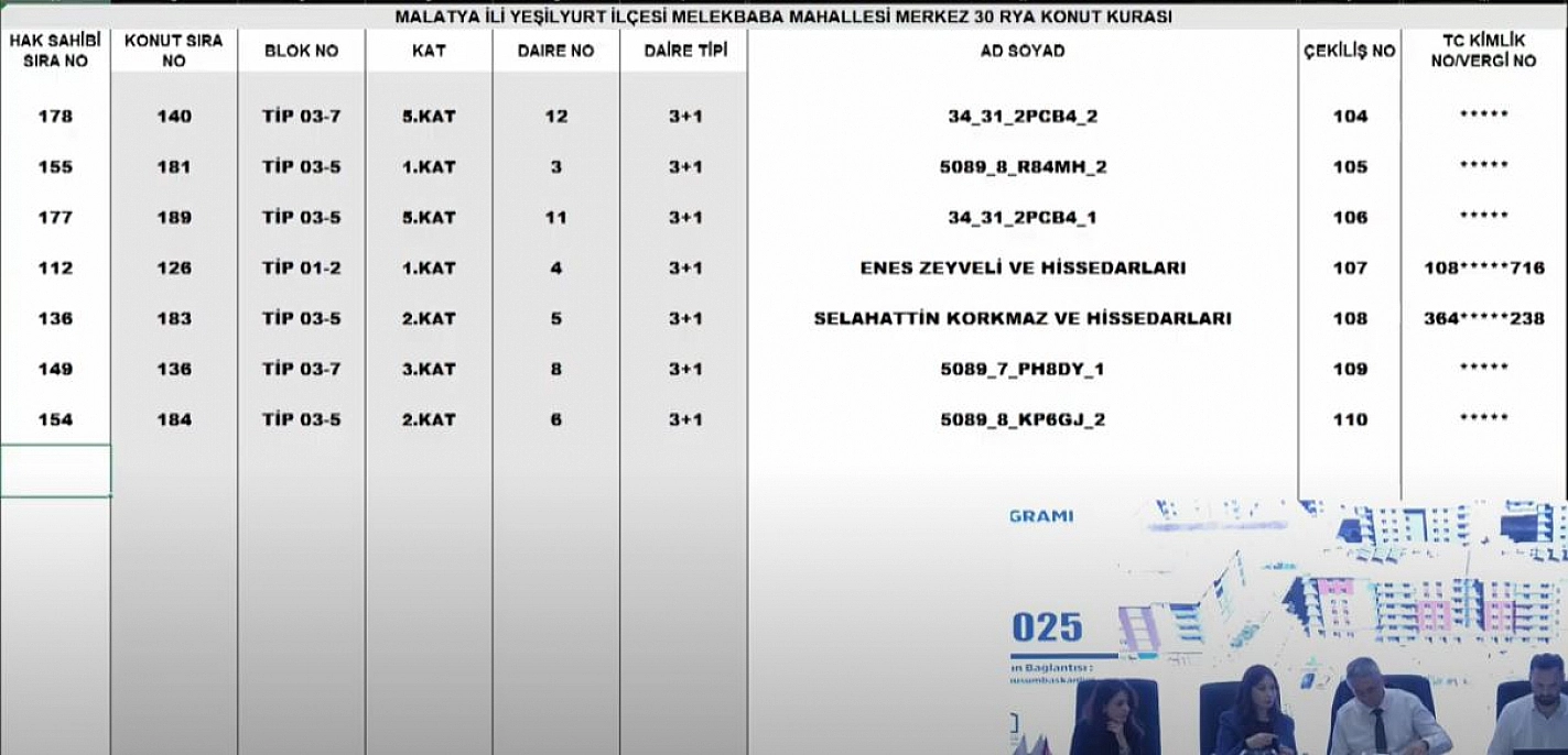 Malatya'da 6 Şubat depremlerinden sonra yapımı tamamlanan deprem konutlarının kurası çekiliyor. Merkez 30 Projesi kapsamında Melekbaba Mahallesi'ndeki 241 konutun kura çekimini sonuçları belli oldu İşte hak sahibi tam liste…