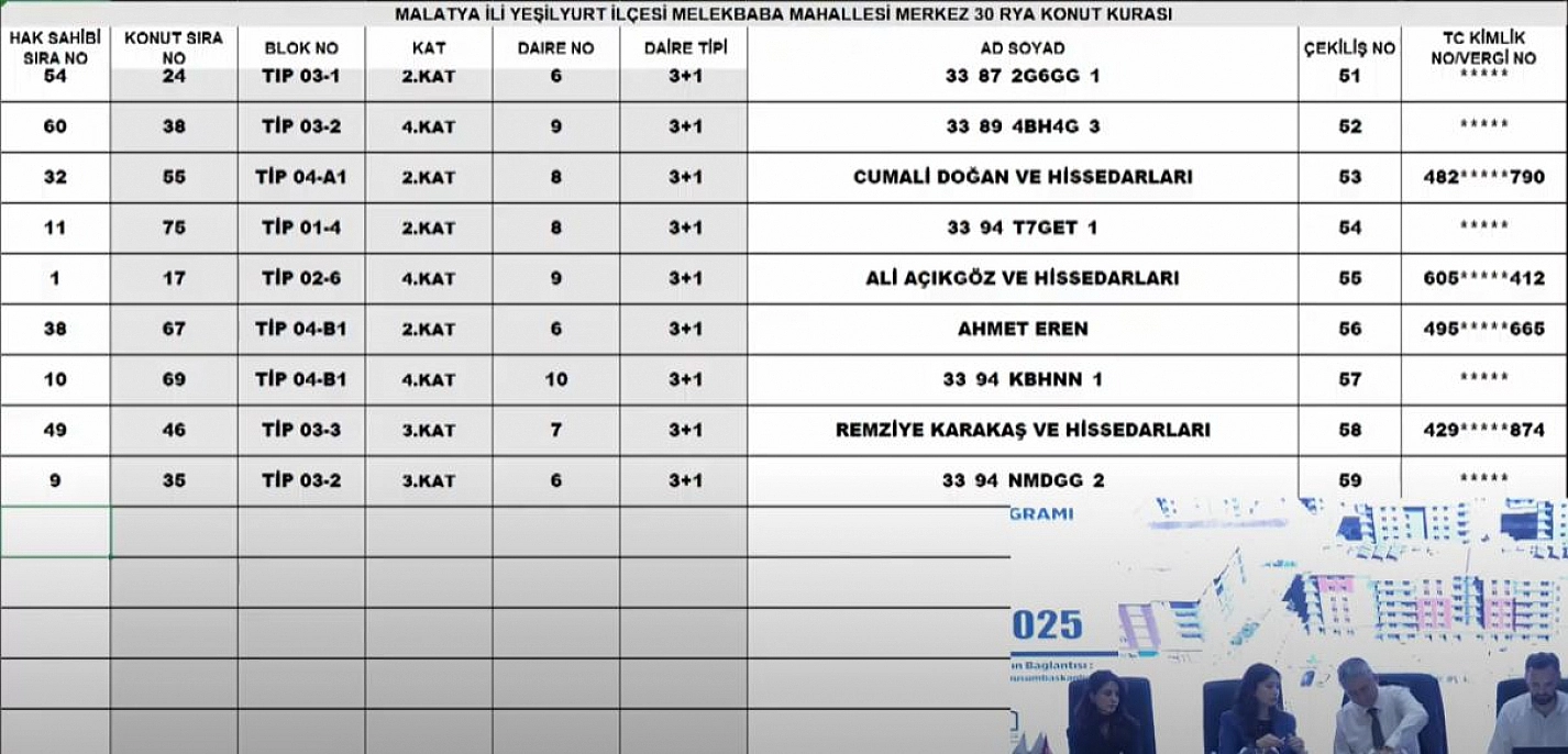 Malatya'da 6 Şubat depremlerinden sonra yapımı tamamlanan deprem konutlarının kurası çekiliyor. Merkez 30 Projesi kapsamında Melekbaba Mahallesi'ndeki 241 konutun kura çekimini sonuçları belli oldu İşte hak sahibi tam liste…
