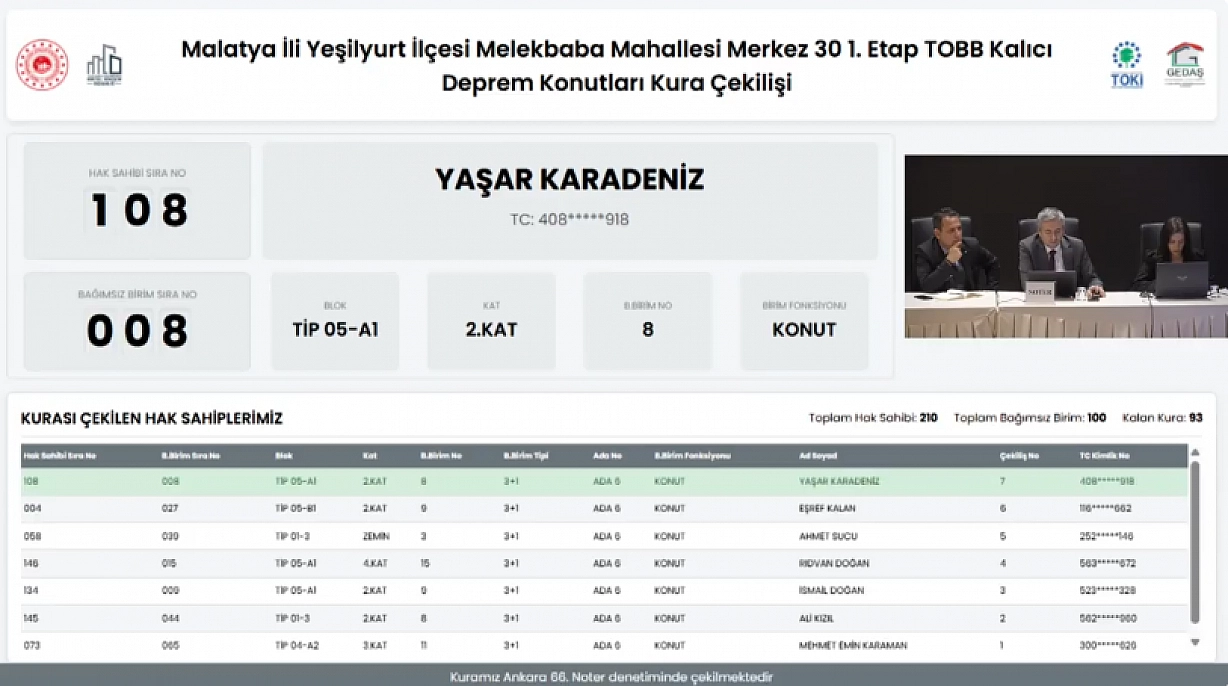 Malatya'da 6 Şubat depremlerinden sonra yapımı tamamlanan deprem konutlarının kurası çekiliyor. Merkez 30 Projesi kapsamında Melekbaba Mahallesi'ndeki 100 konutun kura çekimini sonuçları belli oldu İşte hak sahibi tam liste…