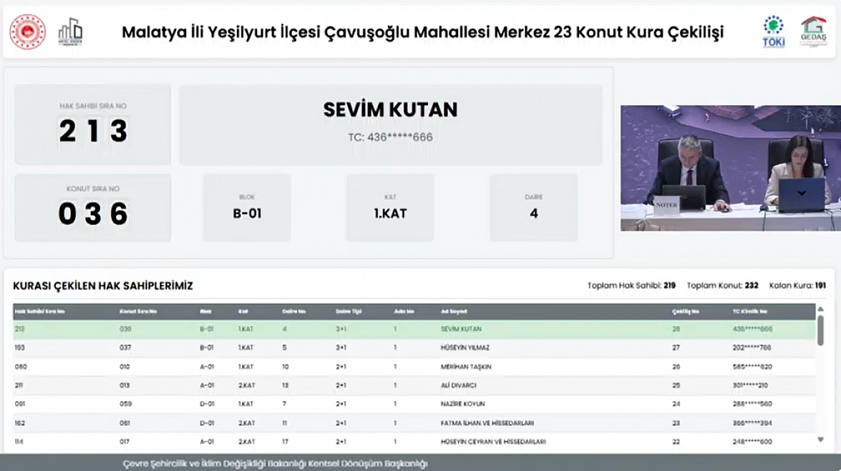 Malatya'da 6 Şubat 2023'teki depremlerde yıkılan veya ağır hasar gören ve yapımı tamamlanan konutların kurası çekiliyor. Yeşilyurt ilçesinde Merkez 23 proje kapsamında Çavuşoğlu Mahallesinde 232 konutun kura çekiminin sonuçları belli oldu.