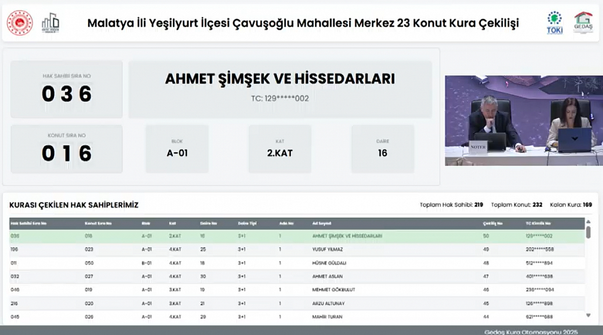 Malatya'da 6 Şubat 2023'teki depremlerde yıkılan veya ağır hasar gören ve yapımı tamamlanan konutların kurası çekiliyor. Yeşilyurt ilçesinde Merkez 23 proje kapsamında Çavuşoğlu Mahallesinde 232 konutun kura çekiminin sonuçları belli oldu.