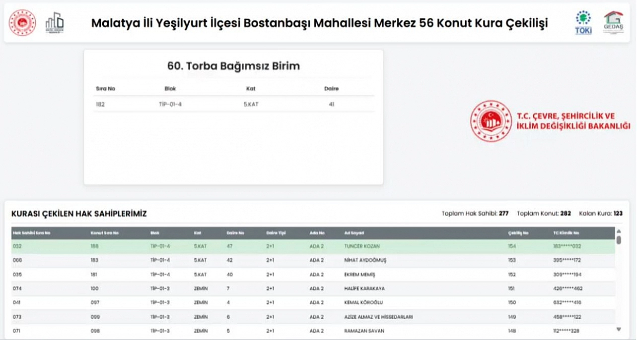 Malatya'da 6 Şubat 2023'teki depremlerde yıkılan veya ağır hasar gören ve yapımı tamamlanan konutların kurası çekiliyor. Yeşilyurt ilçesinde Merkez 56 Projesi kapsamında Bostanbaşı Mahallesinde 282 konutun kura çekiminin sonuçları belli oldu.