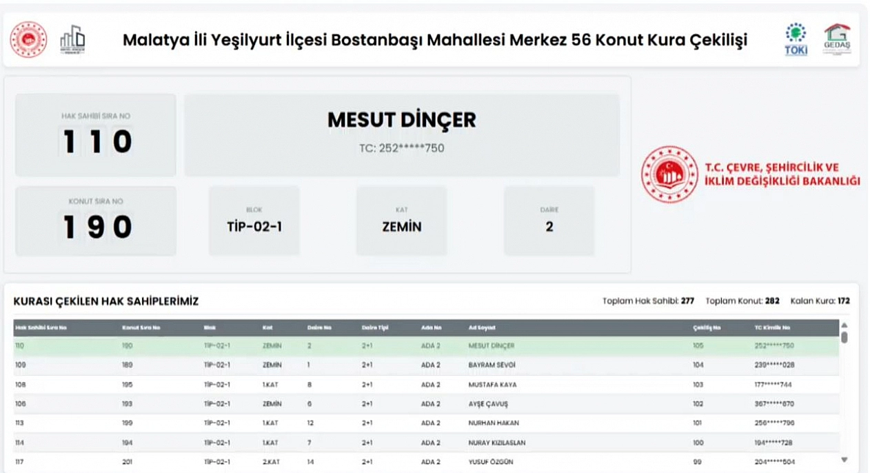 Malatya'da 6 Şubat 2023'teki depremlerde yıkılan veya ağır hasar gören ve yapımı tamamlanan konutların kurası çekiliyor. Yeşilyurt ilçesinde Merkez 56 Projesi kapsamında Bostanbaşı Mahallesinde 282 konutun kura çekiminin sonuçları belli oldu.