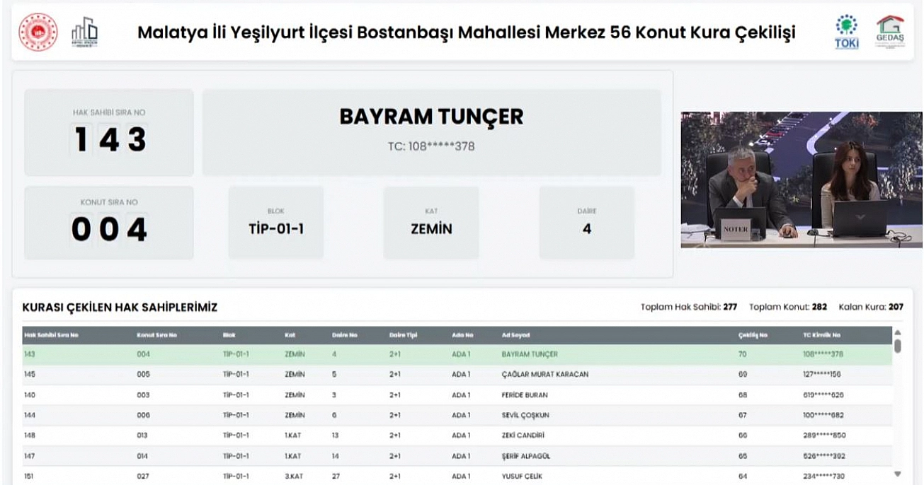 Malatya'da 6 Şubat 2023'teki depremlerde yıkılan veya ağır hasar gören ve yapımı tamamlanan konutların kurası çekiliyor. Yeşilyurt ilçesinde Merkez 56 Projesi kapsamında Bostanbaşı Mahallesinde 282 konutun kura çekiminin sonuçları belli oldu.