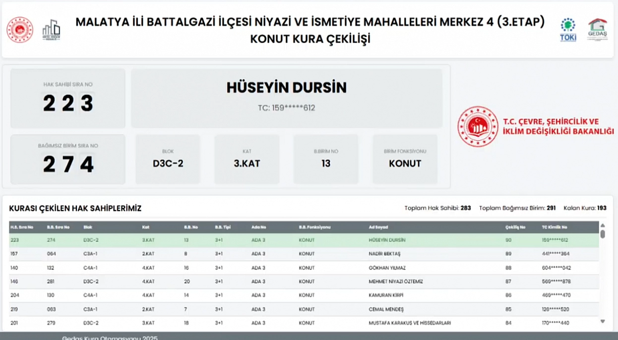 6 Şubat depremlerinin ardından Malatya'nın birçok noktasında kalıcı konut ve iş yeri projeleri tamamlandı. Battalgazi ilçesindeki Merkez 4-3. Etap Projesi kapsamında Niyazi ve İsmetiye Mahalleleri'nde yer alan 283 konut için gerçekleştirilen kura çekimiyle hak sahipleri belli oldu.