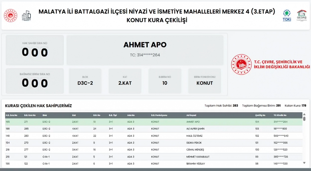 6 Şubat depremlerinin ardından Malatya'nın birçok noktasında kalıcı konut ve iş yeri projeleri tamamlandı. Battalgazi ilçesindeki Merkez 4-3. Etap Projesi kapsamında Niyazi ve İsmetiye Mahalleleri'nde yer alan 283 konut için gerçekleştirilen kura çekimiyle hak sahipleri belli oldu.
