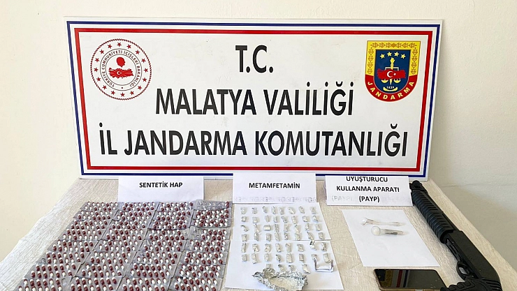 Malatya İl Jandarma Komutanlığınca ‘Uyuşturucu Madde İmal ve Ticareti’ uyuşturucu ile mücadele kapsamında yapılan istihbari neticesinde Battalgazi İlçesinde adli makamlardan alınan arama kararına istinaden 2 şahsın ev ve eklentilerinde yapılan arama neticesinde 60 gram metamfetamin maddesi, 507 adet uyarıcı hap, 1 adet hassas terazi, 2 adet tabanca, 64 adet tabanca fişeği, 1 adet ruhsatsız av tüfeği 3 adet uyuşturucu madde kullanma aparatı ele geçirildi.