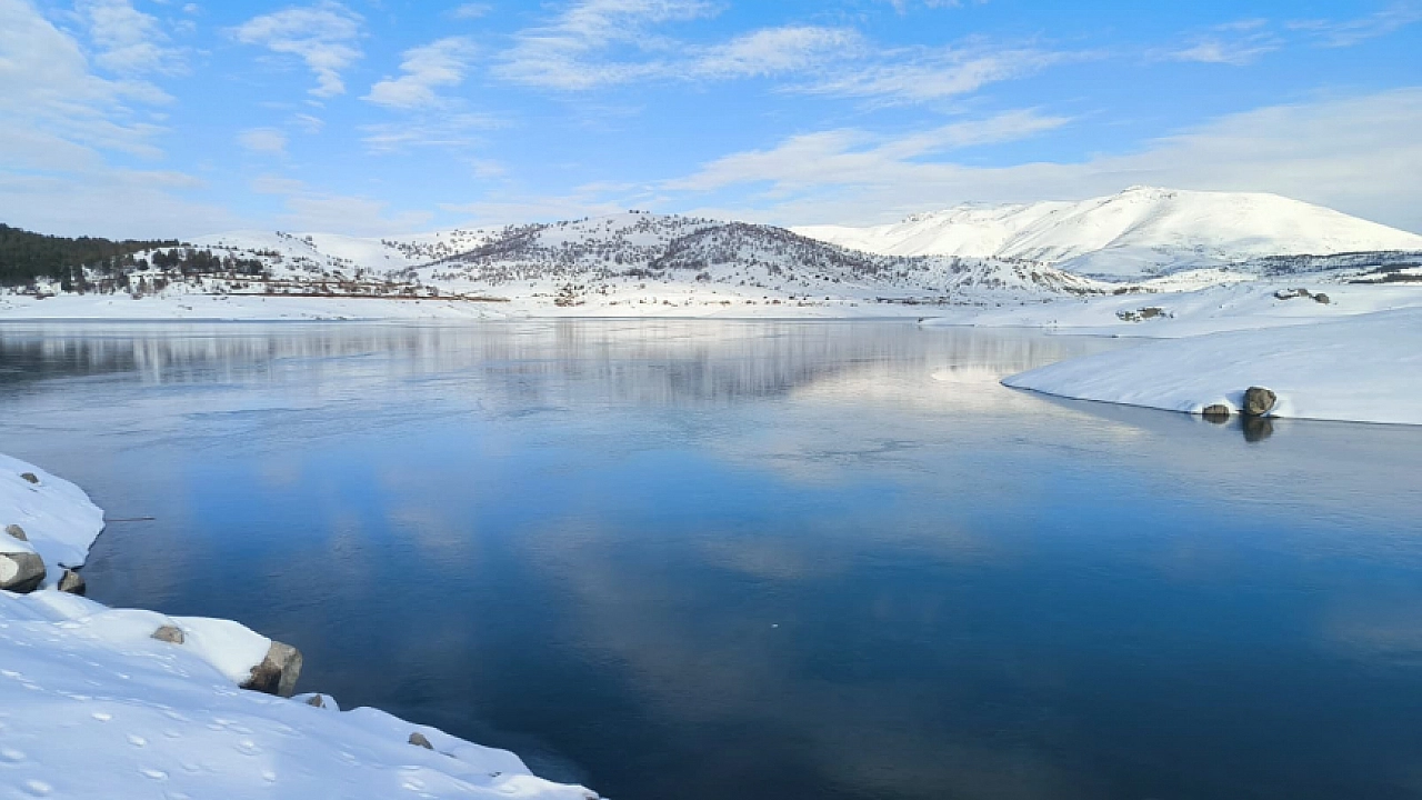 Yağışların ardından beyaza bürünen Sürgü Barajı'nın yüzeyi de buz tabakasıyla kaplandı.