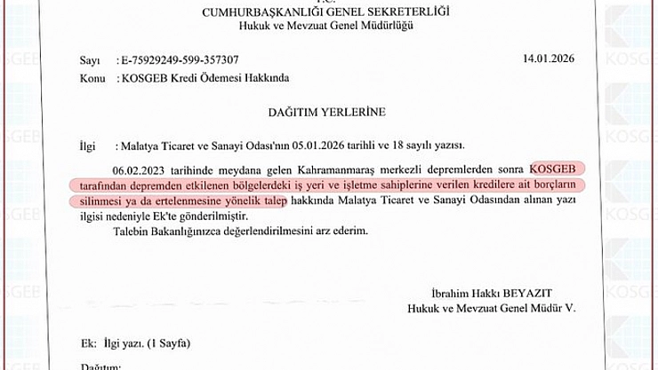 Malatya Ticaret ve Sanayi Odası'nın, deprem bölgesindeki işletmeler için KOSGEB kredi borçlarının silinmesi veya ertelenmesine yönelik talebi, Cumhurbaşkanlığı tarafından Hazine ve Maliye Bakanlığı'na değerlendirilmek üzere iletildi.