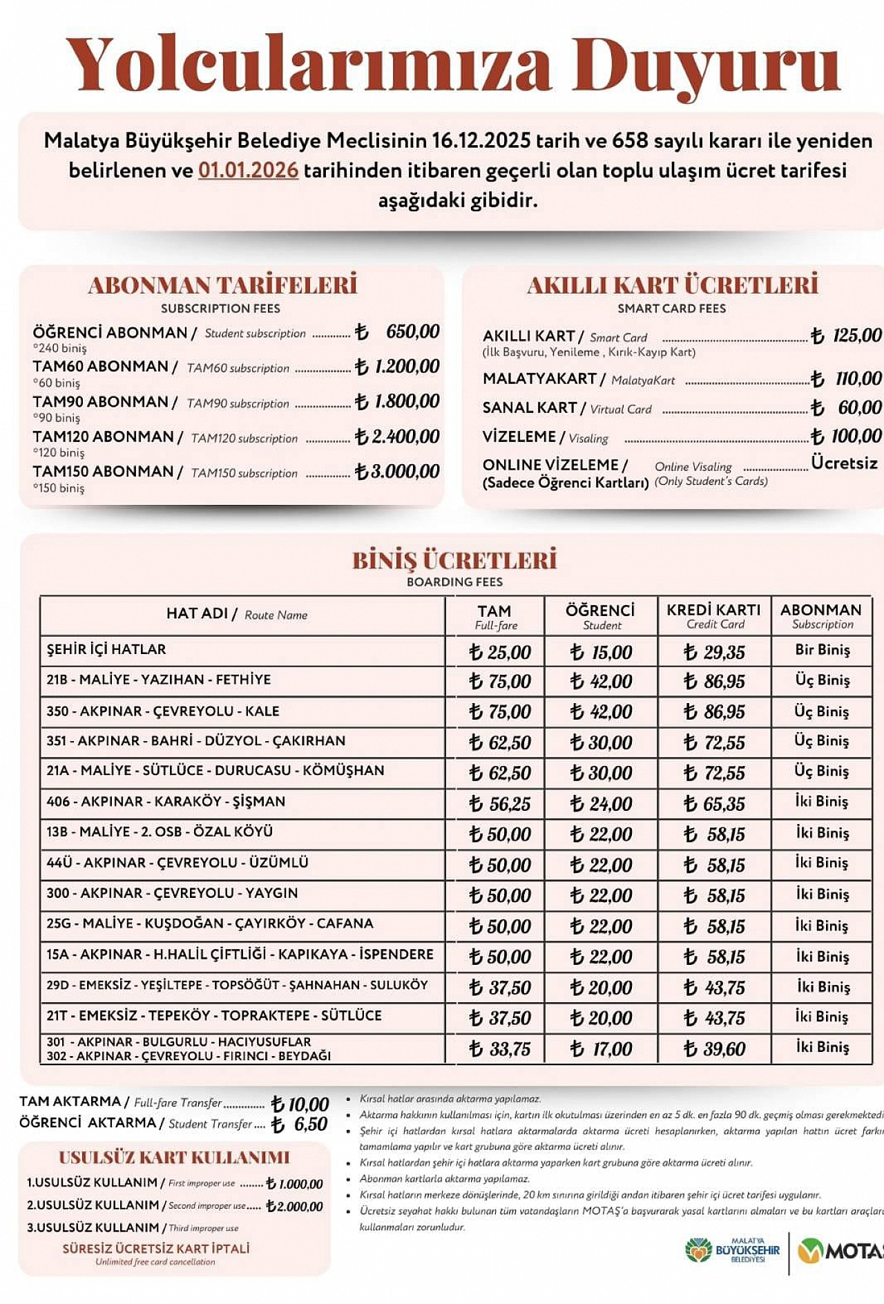 Malatya Büyükşehir Belediyesi Ulaşım Dairesi Başkanlığı tarafından toplu ulaşımda bilet ücretlerine yüzde 25 oranında zam bugünden itibaren fiyatlara yansıyacak. Peki, güncel tarife nasıl?