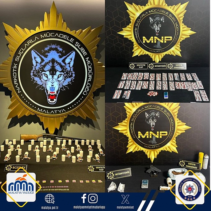 Malatya İl Emniyet Müdürlüğü, kent genelinde yürüttüğü uyuşturucu operasyonuna bir yenisini ekledi. Operasyonda binlerce sentetik madde, ecstasy hap ve ruhsatsız silah ele geçirilirken, 3 kişi tutuklandı, 2 kişi gözaltına alındı.