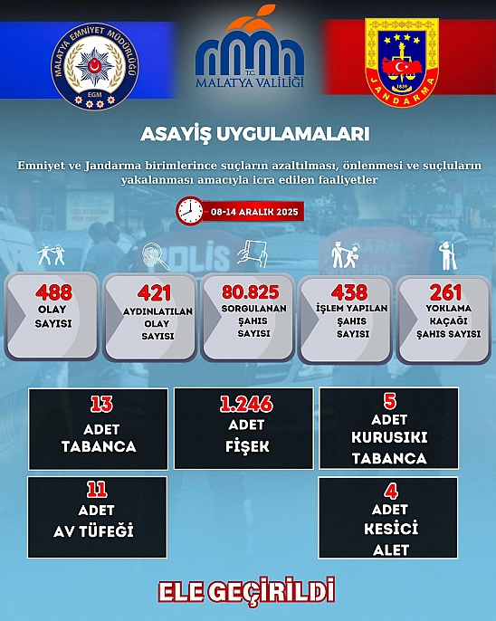 Malatya İl Emniyet Müdürlüğü, 8-14 Aralık tarihleri arasında gerçekleştirilen asayiş operasyonlarının verilerini paylaştı. Operasyonlarda 371 gram metamfetamin, 20 gram esrar, 4 gram sentetik kannabinoid ile bin 554 adet sentetik ecza ele geçirildi.