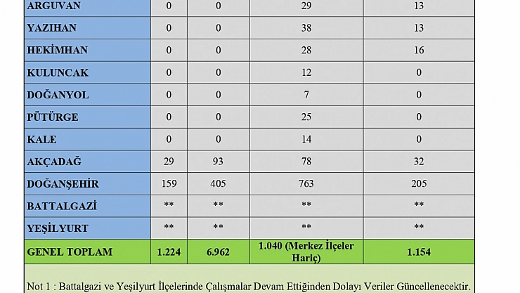 Malatya Valiliği deprem durum çizelgesini açıkladı. Açıklanan rakamlara göre Malatya genelinde bin 154 bina yıkılırken, vefat edenlerin sayısı bin 224'e yükseldi.