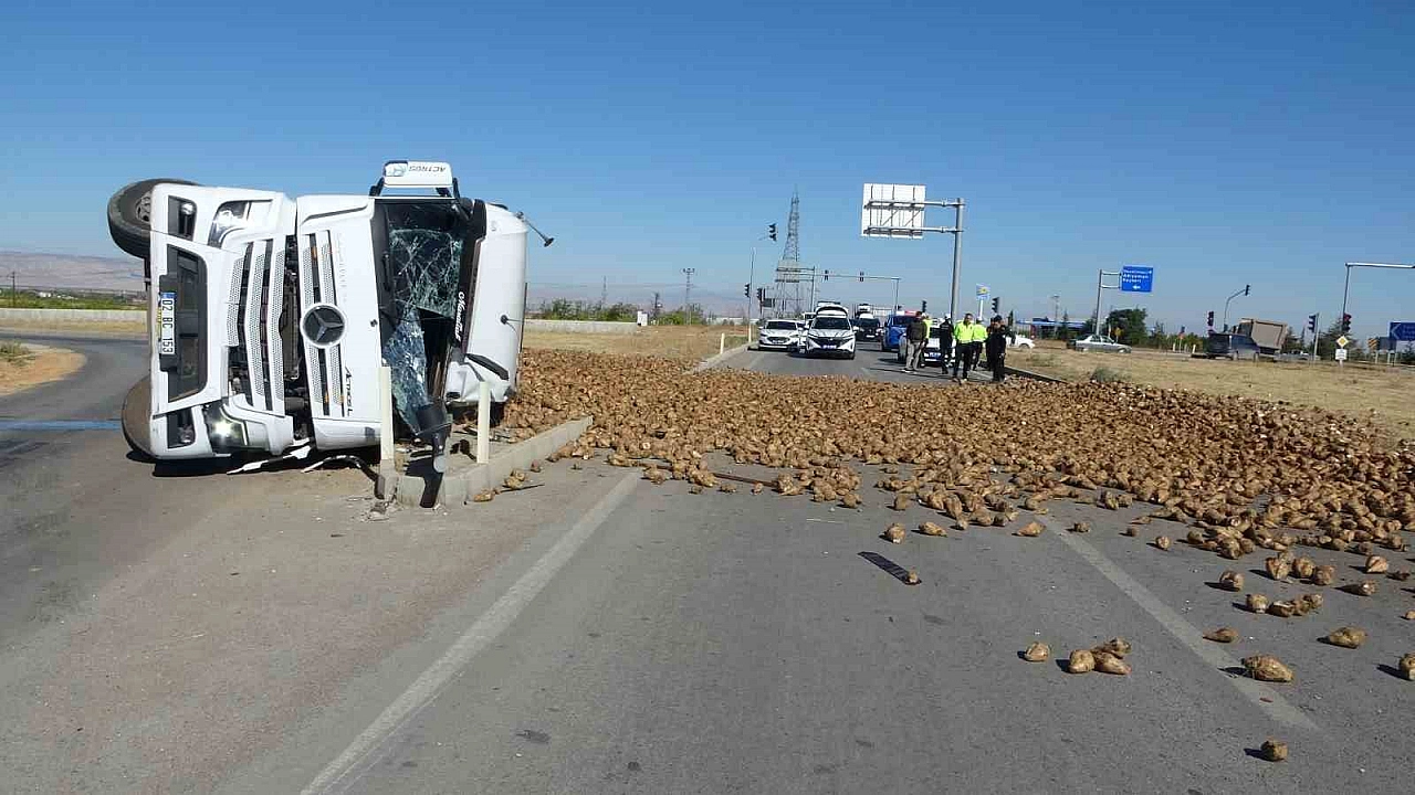 Kontrolden çıkan araç devrilirken, taşıdığı tonlarca pancar yola saçıldı. Kazada tır sürücüsü yaralandı. Olay yerine gelen sağlık ekipleri tarafından ilk müdahalesi yapılan yaralı sürücü, ambulansla hastaneye sevk edildi.