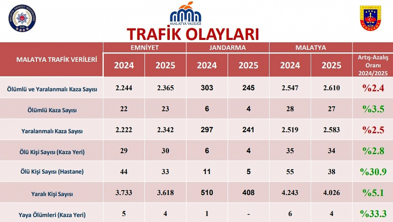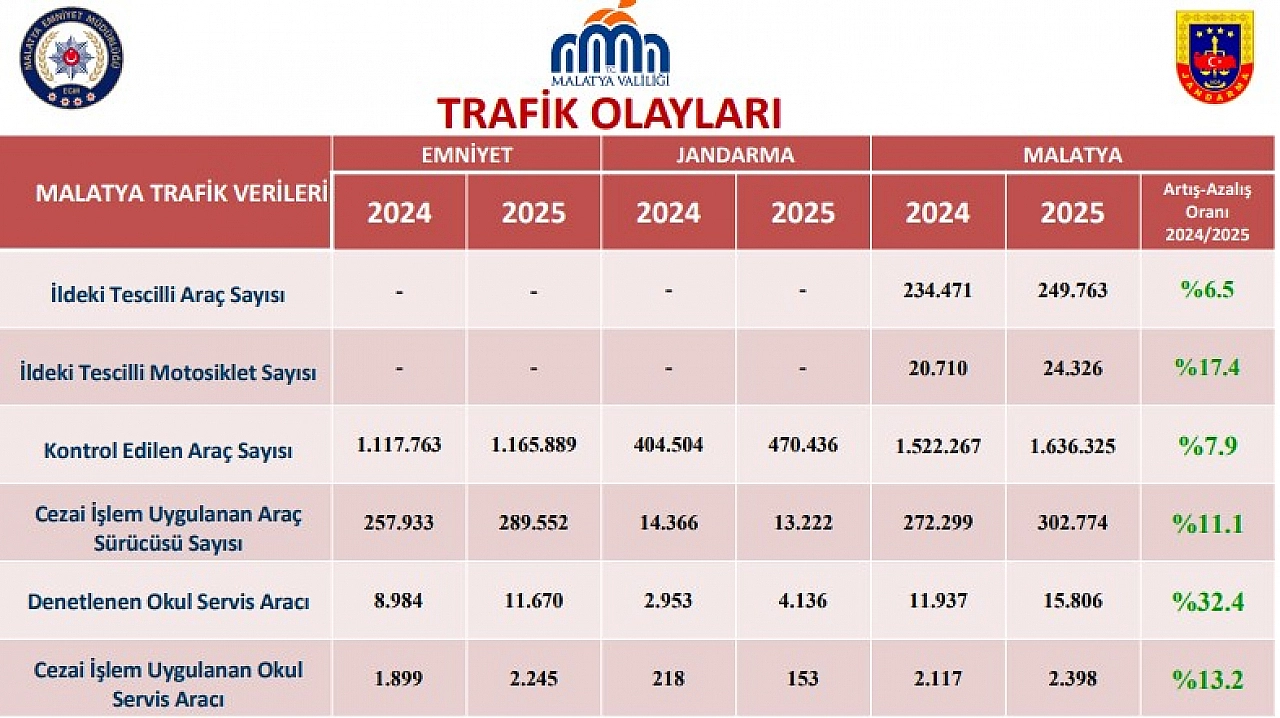 Malatya’da art arda yaşanan trafik kazaları, trafik güvenliğini yeniden gündeme getirdi. Son bir yılda araç sayısı yaklaşık yüzde 6 artarken, kazalar yüzde 2,4 oranında artış gösterdi.