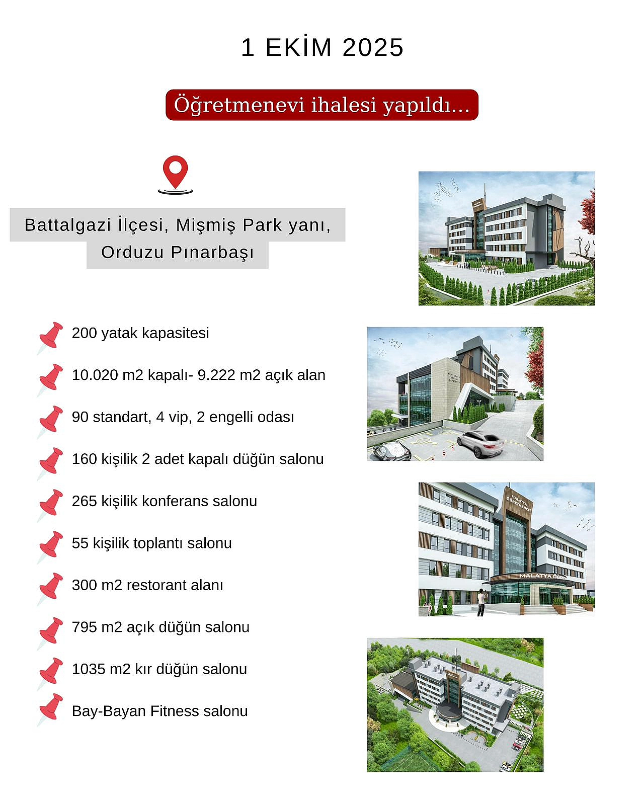 6 Şubat depremlerinde ağır hasar gördüğü için yıktırılan Malatya Öğretmenevi'nin yerine Orduzu Pınarbaşı'nda yapılacak yeni tesisin projesi tamamlandı. 200 yatak kapasiteli ve göl manzaralı olarak tasarlanan binanın ihalesi gerçekleştirildi.
