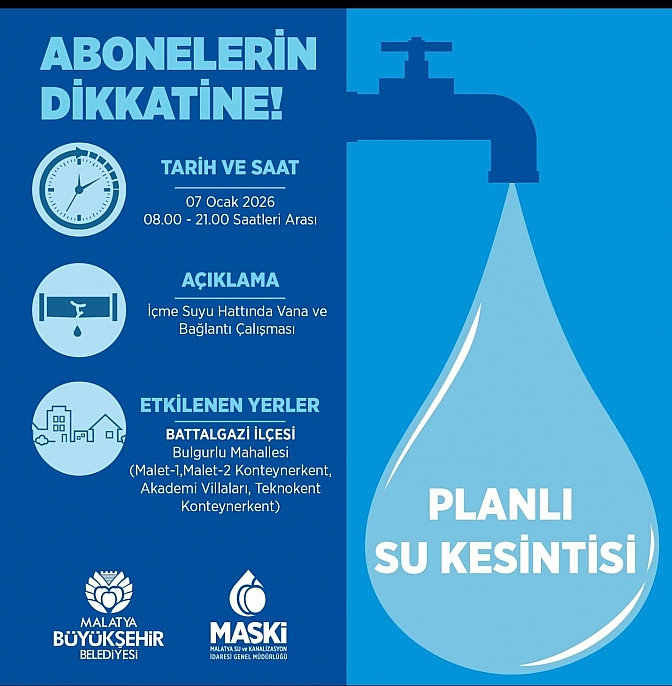 Malatya'nın Battalgazi ilçesinde içme suyu hattında yapılacak çalışmalar nedeniyle 7 Ocak'ta planlı su kesintisi uygulanacak.