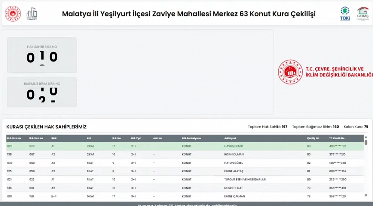 Malatya'da 6 Şubat 2023'teki depremlerde yıkılan veya ağır hasar gören ve yapımı tamamlanan konutların kurası çekiliyor. Merkez 63 Projesi kapsamında Zaviye Mahallesi'nde 160 konutun kura sonuçları belli oldu.