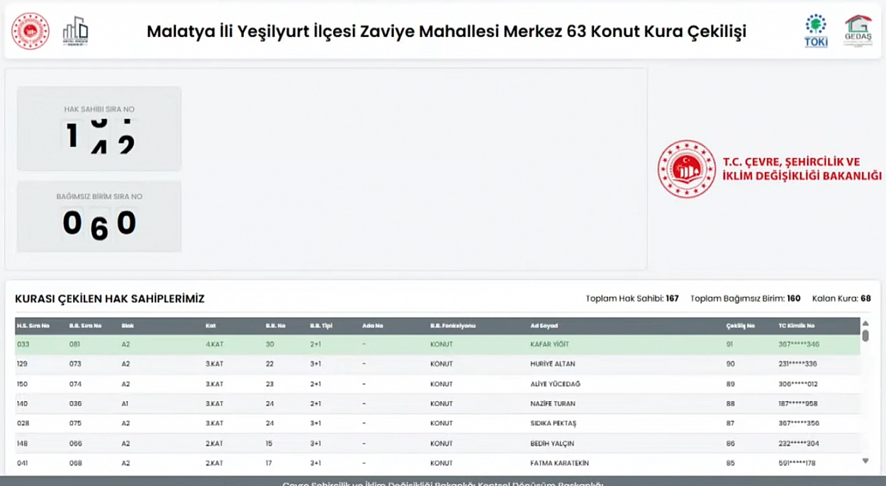 Malatya'da 6 Şubat 2023'teki depremlerde yıkılan veya ağır hasar gören ve yapımı tamamlanan konutların kurası çekiliyor. Merkez 63 Projesi kapsamında Zaviye Mahallesi'nde 160 konutun kura sonuçları belli oldu.