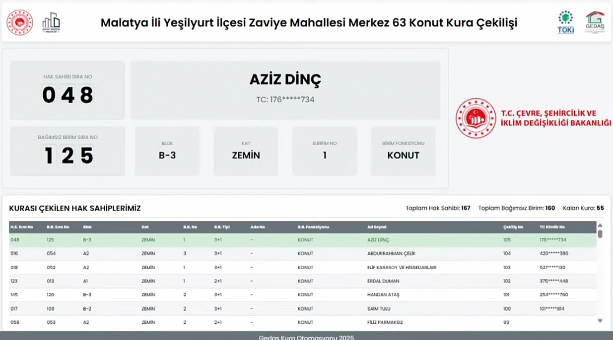 Malatya'da 6 Şubat 2023'teki depremlerde yıkılan veya ağır hasar gören ve yapımı tamamlanan konutların kurası çekiliyor. Merkez 63 Projesi kapsamında Zaviye Mahallesi'nde 160 konutun kura sonuçları belli oldu.