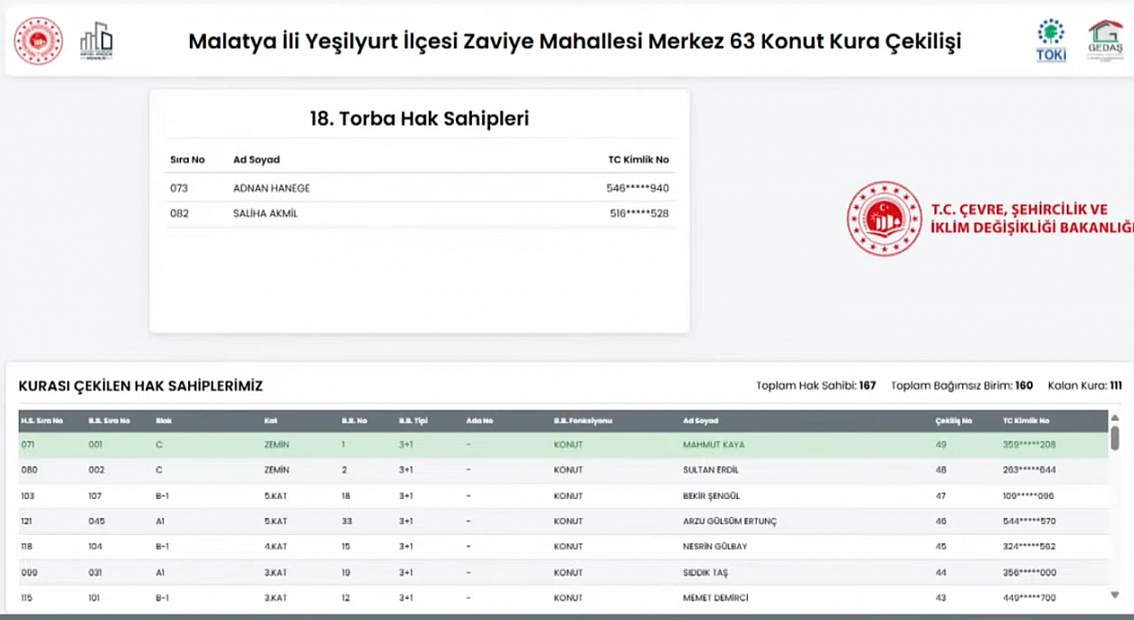 Malatya'da 6 Şubat 2023'teki depremlerde yıkılan veya ağır hasar gören ve yapımı tamamlanan konutların kurası çekiliyor. Merkez 63 Projesi kapsamında Zaviye Mahallesi'nde 160 konutun kura sonuçları belli oldu.